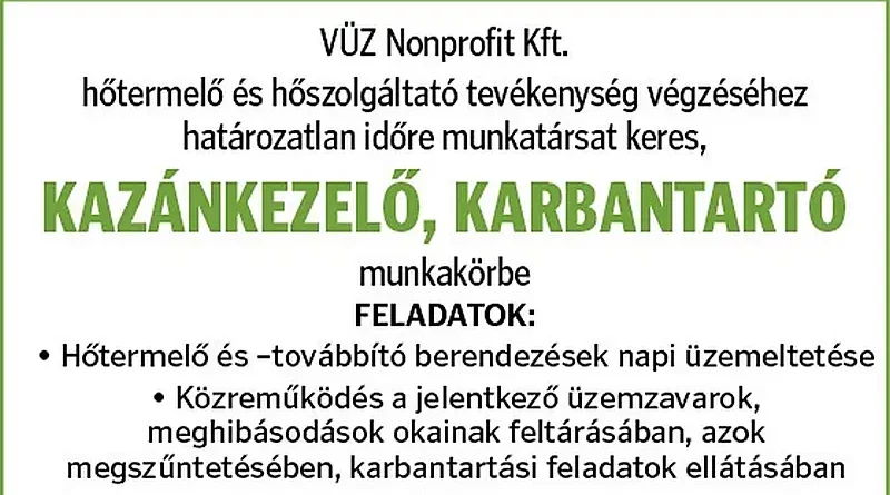 A VÜZ Nonprofit Kft. hőtermelő és hőszolgáltató tevékenység végzéséhez határozatlan időre munkatársat keres KAZANKEZELŐ, KARBANTARTÓ munkakörbe FELADATOK: Hőtermelő-  és továbbító